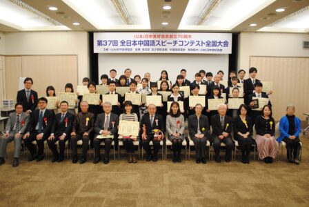 (公社)日中友好協会主催の「第37回全日本中国語スピーチコンテスト全国大会」が1月12日、東京・文京区の日中友好会館で開催されました。地方大会を勝ち抜いた22人が出場し、高校生・一般・大学生の3部門に分かれ〝中国語の力〟を競い合いました。最も優秀な人に贈られる日中友好協会会長賞には愛知県の公務員・山真以さんが選ばれました。