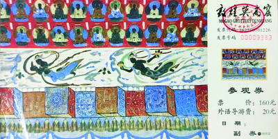 ユネスコ世界遺産にも登録されている莫高窟は、1.6kmにわたる断崖に2400体以上の仏像が並んでおり、その神秘的な雰囲気と壮大なスケールは圧巻の一言だ。美しいイラストが描かれたチケットには、外国語ガイド料(おそらく英語だったはず)20元との表記があるが、筆者の語学力では理解できなかったせいか、まったく記憶にない。