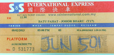 ⑨は「国際快車」の繁体字がみえるので、香港のチケットと思われるかもしれないが、バトゥ・パハとジョホール・バルを結ぶバスチケット(マレーシア)である。バトゥ・パハは、放浪詩人・金子光晴がこよなく愛した静かな街で、ジョホール・バルはシンガポールとの国境の街。漢字が用いられていることからも分かるように、華人・華僑が多いマレーシアやシンガポール(中国語が公用語のひとつ)では、中国語を話せると困らない。