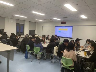 日本語学科の授業に参加させていただいた時の写真。まず初めに日本人留学生が自己紹介をして、それぞれグループに分かれて日本の文化、中国の文化について話し合いました。