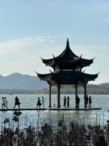西湖で撮影。(左)集賢亭。街中の広告などにも使われていた。(右)西湖湖岸から望む雷峰塔。