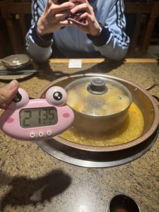 キノコ鍋、食中毒予防のため25分煮なければ箸を付けられません。店員さんがタイマーをセットします。
