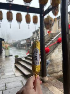 紹興酒の棒アイス。かすかにアルコールが感じられるデザートだった。私はお酒を飲むとすぐに顔が赤くなるタイプだが、案の定ひとくちかじっただけで赤くなってしまった。