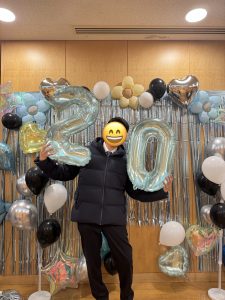 用意されたフォトブースで撮影、2月に21歳になったばかりですが、20の風船を両手に写真を撮りました。