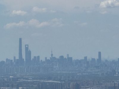 飛行機から見えた上海中心部の高層ビル群