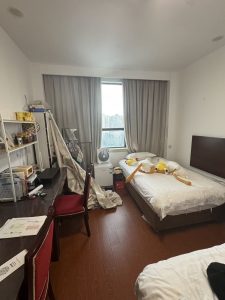 また、最初に割り当てられた寮の部屋でも問題がありました。ルームメイトが部屋を勝手に改造していて、自分が使えるスペースがとても狭く、ほとんど身動きが取れない状態でした。相手はすでに帰国しており、荷物も多く残されていたため、整理することもできず、不便な日々を過ごしました。そのときは本当に困ってしまい、どうすればよいのか悩みました。