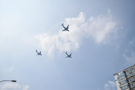 北京上空を飛行する航空機の隊列の様子、頭上を通るたびに歓声が上がります。