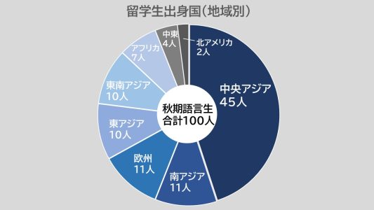 また手続き中、学生に中央アジア出身の方が多いことを感じました。以下のグラフからも分かる通り、中国語を学ぶ語言生の約半数が中央アジア出身です。中央民族大学にはイスラム系少数民族の学生が多く在籍するため、ハラル専用の食堂が存在します。他の大学に比べてイスラム系の学生が生活しやすいことが中央アジアの学生にこの大学が選ばれる要因の一つかと思います。