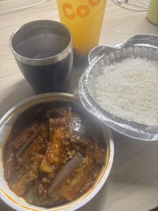 ![]() 夜ご飯は外卖して部屋で食べることが多いです。写真は谷田稻香というお店の麻婆ナスセット。 |