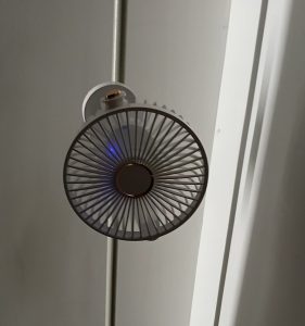扇風機。蚊帳用の柱に掛ける。