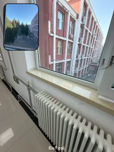 大学の廊下にある暖气、(窓の下の白いものが暖气です)