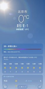 また、11月に入ると「暖气」という24時間つけっぱなしの暖房が使われ始めます。暖气のおかげで室内は非常に暖かく、ヒートテックが必要ない日もあります。しかし、暖房が強く乾燥しています。外は風が強く、気温が低いため、室内との寒暖差が激しいのも北京の特徴です。暖气がつく前の10月は、夜の冷え込みが特に厳しく、重ね着をして寒さに備えていました。