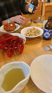 11月下旬には日本から友人が訪れ、上海のグルメを一緒に堪能しました。四川料理店では初めてカエル料理に挑戦しました。プリプリとした食感で、おいしかったです。上海蟹は値段こそ張りましたが、味は格別でした。ザリガニも臭みが少なく、意外と食べやすかったです。(写真10、写真11、写真12)
