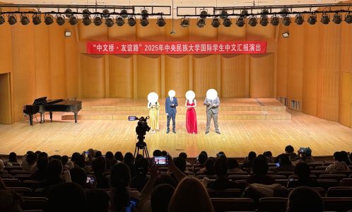 次に、12月末に実施された「留学生演目発表会」について報告します。中央民族大学では毎年この時期に、留学生による発表会が開催されており、語言生の各クラスおよび本科留学生、計9組が出場しました。発表内容は自由で、寸劇、スピーチ、歌唱など、各クラスが工夫を凝らした演目を披露しました。